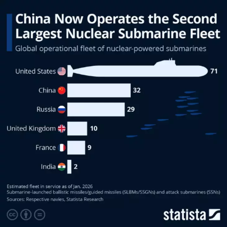 Pavodle acenak analityčnaj płatformy Marine Insight, na pačatak 2026 hoda ŭ składzie VMS Kitaja naličvajecca 32 dziejnyja atamnyja submaryny, biez uliku karabloŭ, jakija znachodziacca ŭ pracesie budaŭnictva. Lidaram u hetaj śfiery pa-raniejšamu zastajucca ZŠA, jakija ekspłuatujuć 71 atamnuju padvodnuju łodku roznych kłasaŭ.