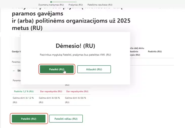 Na finalnym etapie vam treba budzie jašče dvojčy nacisnuć na «Pateikti» (Padać). Spačatku ŭ levym nižnim kucie, a paśla va ŭspłyvajučym akiency.