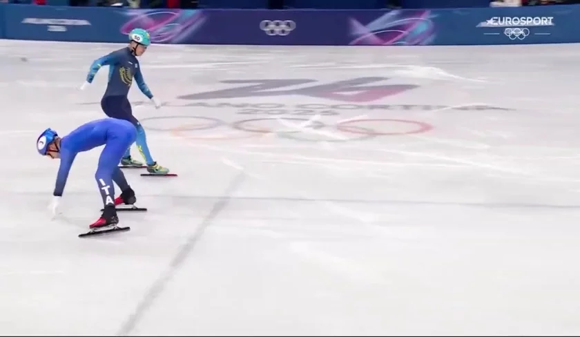 Kazachstanski spartsmien Abzał Ažhalijeŭ vielmi niezvyčajnym čynam prabiŭsia ŭ čverćfinał u šort-treku na dystancyi 500 mietraŭ na Hulniach-2026.
