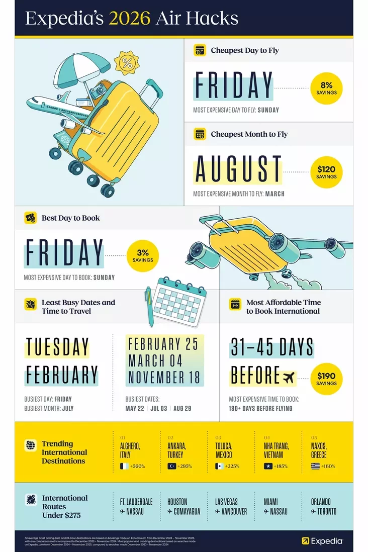 U dakładzie Expedia 2026 Air Hacks pryvodziać łajfchaki dla padarožnikaŭ. Voś klučavyja momanty.