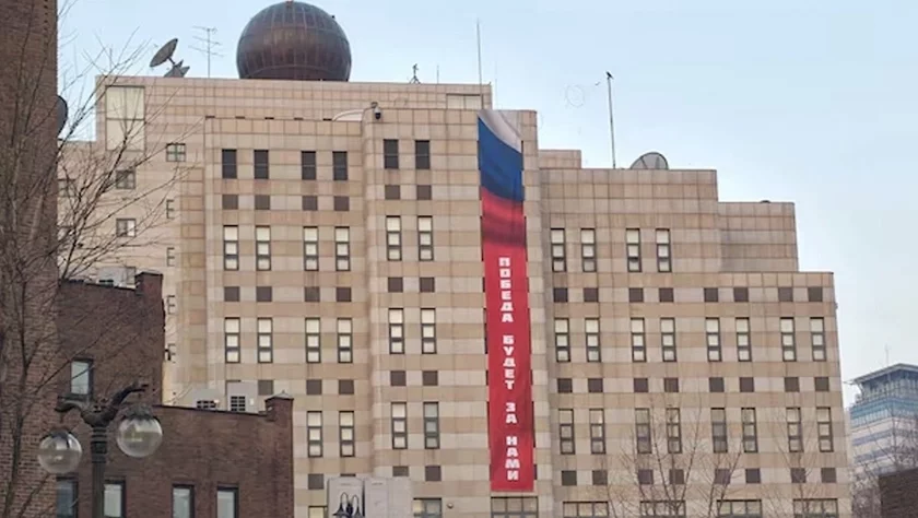 Rasijskaja ambasada ŭ Karei vyviesiła banier «Pobieda budiet za nami»