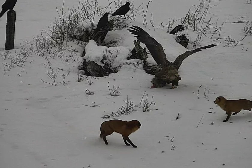 Na litoŭskim baku miažy, u Salečnickim rajonie, arłan-biełachvost sa zdabyčaj pryciahnuŭ uvahu dvuch lisaŭ. Zdabyča, vidać, vyhladała vielmi pryvabna, adnak ryžyja drapiežnicy dziejničali aściarožna i nie advažylisia ŭstupać u pramy kanflikt z bujniejšaj i macniejšaj ptuškaj.