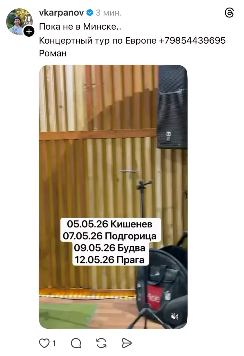 «Pakul nie ŭ Minsku… Kancertny tur pa Jeŭropie», — napisaŭ Karpanaŭ.