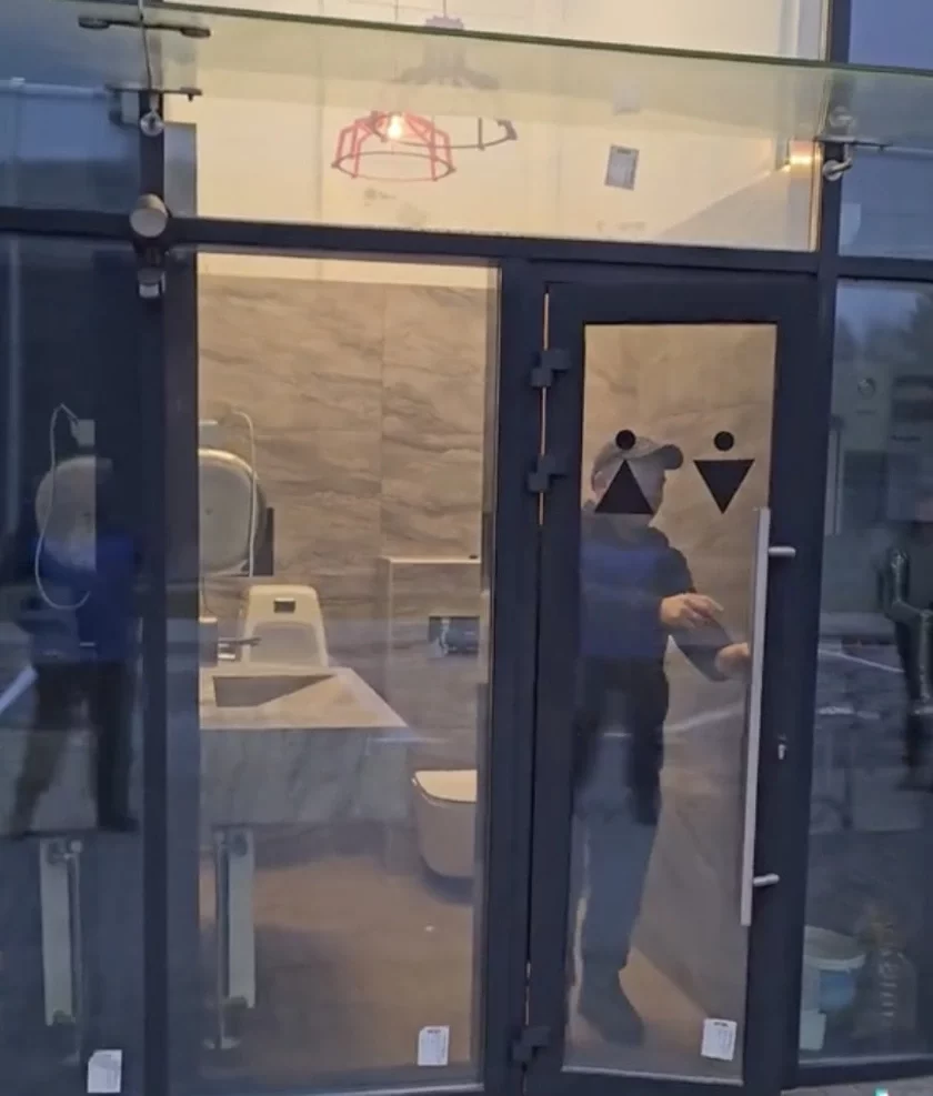 Hałoŭnaja razynka novaj myjki — heta toje, što sanvuzieł tut z całkam prazrystymi šklanymi ścienami. Zvonku heta ŭražvaje: prazrystaja kabinka pasiarod vulicy.