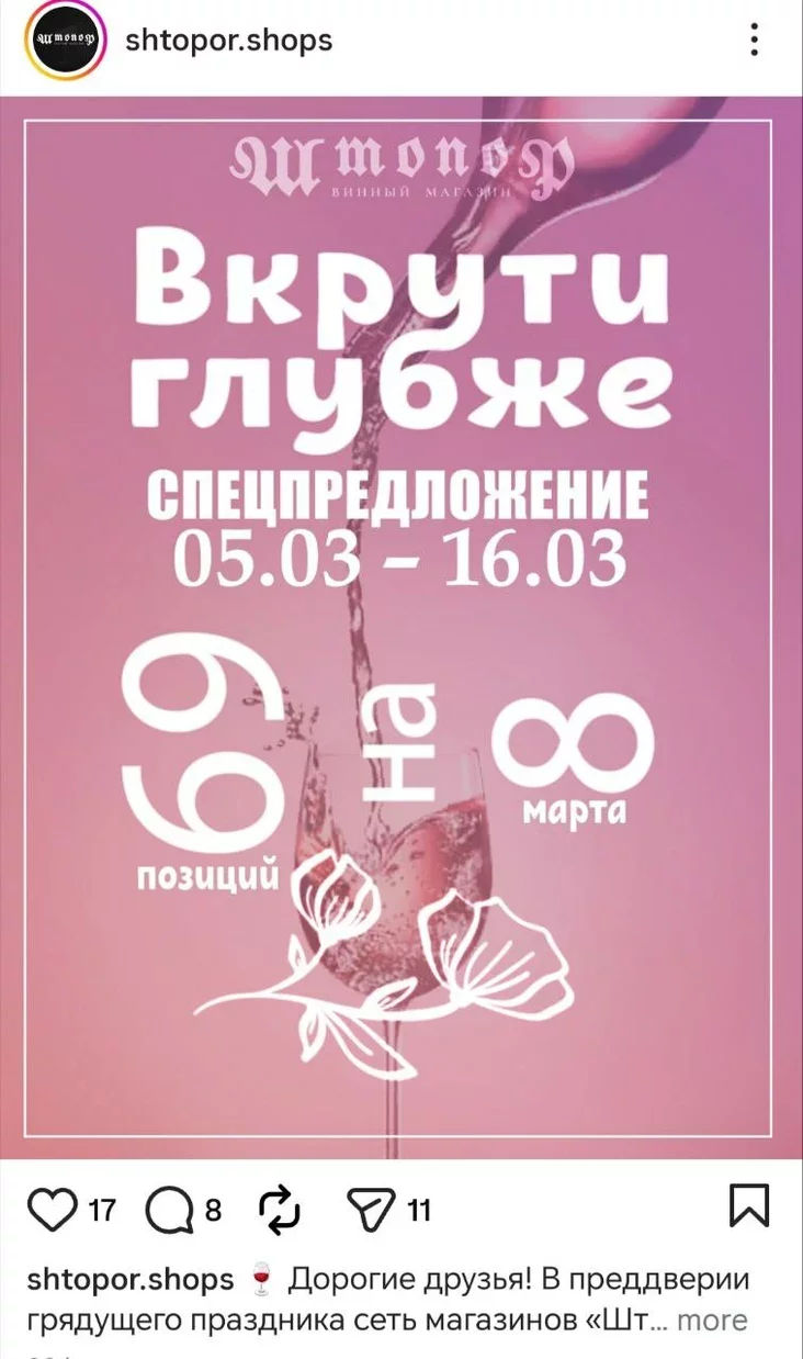 Učora ŭ ich instahramie źjaviłasia rekłama z šmatsensoŭnym zahałoŭkam «Ukruci hłybiej»: abiacajuć 69 pazicyj da 8 sakavika (ličba 8 pry hetym pierakulenaja na bok jak znak biaskoncaści).
