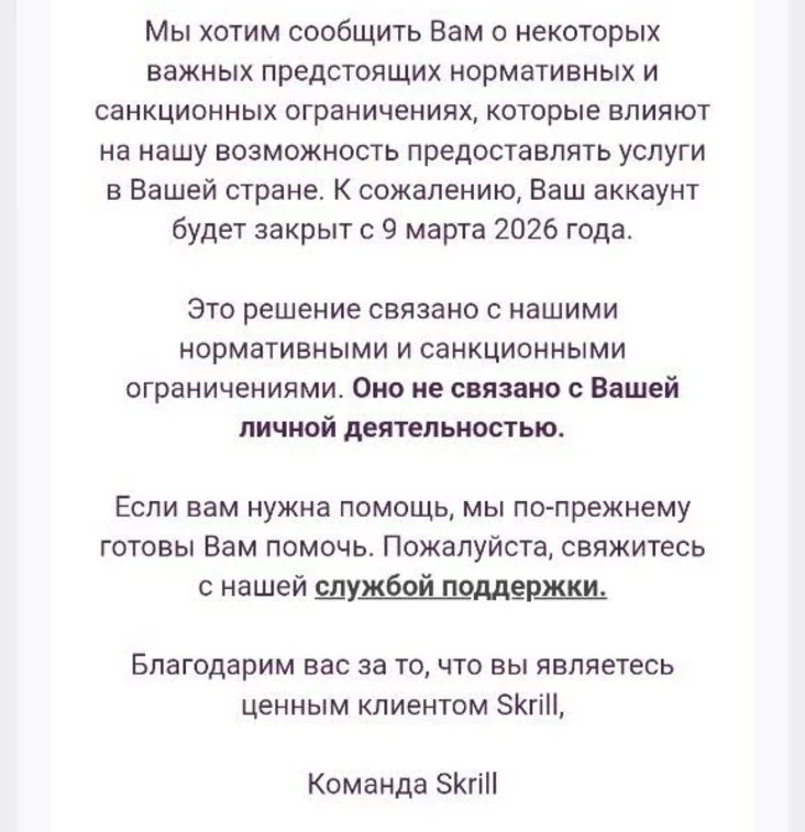 Elektronnaja apłatnaja sistema Skrill, zasnavanaja ŭ Łondanie, pačała błakavać rachunki biełarusaŭ. Karystalniki atrymlivajuć paviedamleńni, što «sankcyjnyja abmiežavańni ŭpłyvajuć na mahčymaść akazańnia pasłuh u vašaj krainie», piša Office Life.
