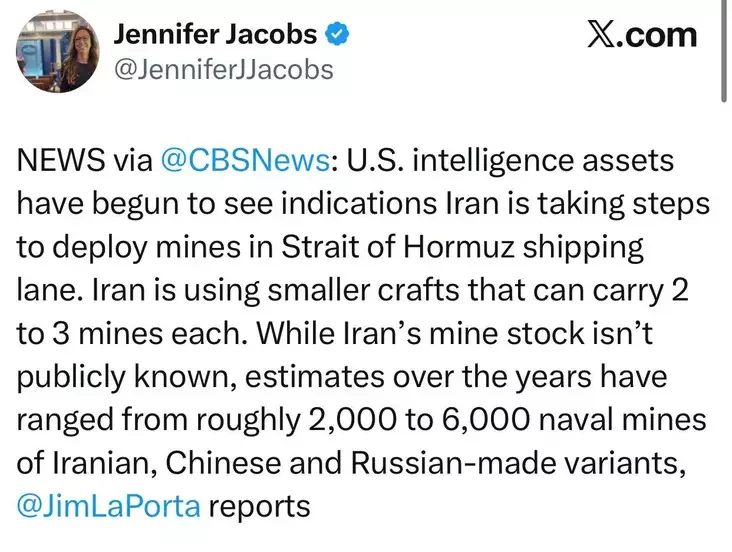 Raźviedka ZŠA daviedałasia pra płany Irana zaminavać Armuzski praliŭ. Pavodle źviestak telekanała CBS, Iran rychtujecca vykarystać dla hetych metaŭ nievialikija sudny, kožnaje ź jakich moža pieravozić pa dźvie-try miny.