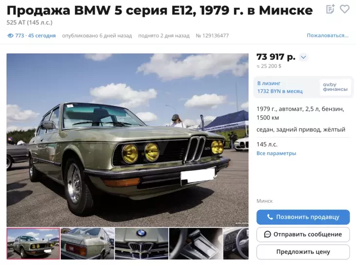 Piaciorka ŭ kuzavie E12 — heta pieršaje pakaleńnie BMW 5-sieryi. Madel vypuskałasia z 1972 pa 1981 hod. Mašyna, jakuju pradajuć u Minsku, 1979 hoda vypusku, to-bok užo restajlinhavaja.