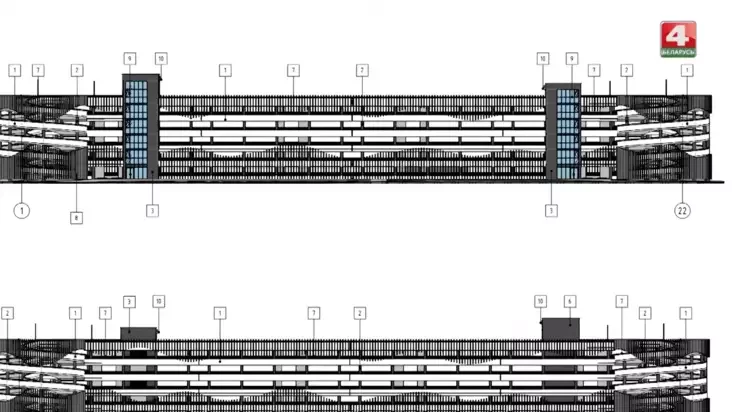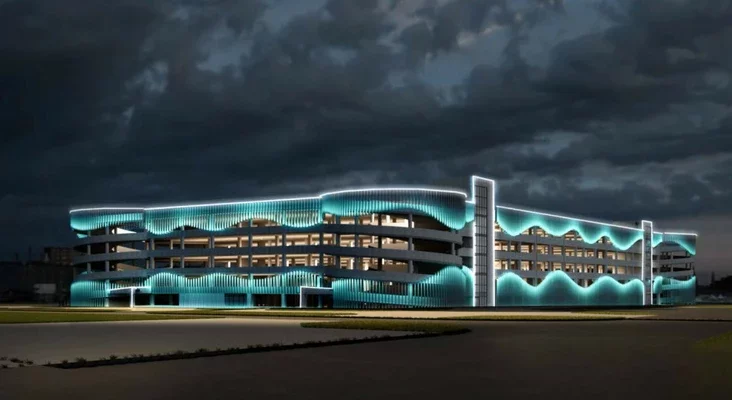 Dla takoj vialikaj kolkaści naviedvalnikaŭ kompleksu zaprajektavany hihancki naziemny parkinh na 1350 mašyna-miescaŭ. U jaho architektury taksama vykarystany matyŭ chvalepadobnych pałos, nabranych na fasadzie z dapamohaj viertykalnych mietaličnych łamielaŭ roznaj daŭžyni.