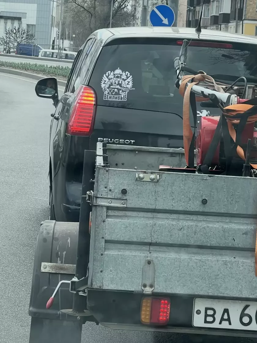 Mašynu Peugeot z nalepkaj, na jakoj vyjaŭleny vajskoviec z aŭtamatam na fonie rasijskaha arła ź dźviuma litarami Z na kryłach i podpisam «Viežlivyje», zaŭvažyŭ adzin z karystalnikaŭ sacsietak.