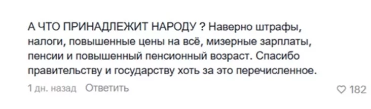 Niekatoryja vykazvańni hučać vostra: «A što naležyć narodu? Napeŭna, štrafy, padatki, padvyšanyja ceny na ŭsio, mizernyja zarobki, piensii i pavyšany piensijny ŭzrost. Dziakuj uradu i dziaržavie choć za heta pieraličanaje».