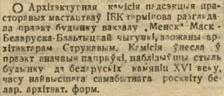 Pieršapačatkovy prajekt maskoŭskaha majstra Ivana Strukava, aŭtara Biełaruskaha vakzała ŭ Maskvie, trapiŭ pad žorstkuju krytyku architekturnaj kamisii Inbiełkulta. Ad jaho zapatrabavali pierapracavać fasady tak, kab jany nahadvali biełaruskuju kamianicu šasnaccataha stahodździa.
