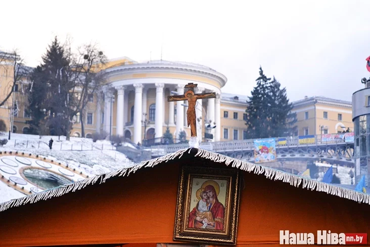 «Находиться здесь — наш выбор как граждан и, вместе с тем, как представителей церкви, — говорит отец Миколай из украинской греко-католической церкви. Его мы застали у палатки-часовенки, установленной на Майдане Независимости. — Эта часовня стоит на месте, где пролилась кровь в ночь на 7 декабря, во время первого разгона Евромайдана. Кровь невинных людей, вышедших на мирную демонстрацию. Мы не становимся под какие-либо политические лозунги. Мы молимся за людей и вместе с людьми. Церковь должна быть с людьми, а люди здесь, поэтому и мы здесь».