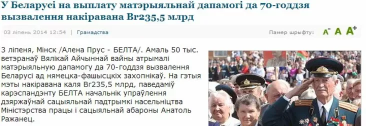 Через пару же минут сообщила, что «почти 50 тыс. ветеранов Великой Отечественной войны получили материальную помощь к 70-летию освобождения Беларуси от немецко-фашистских захватчиков».