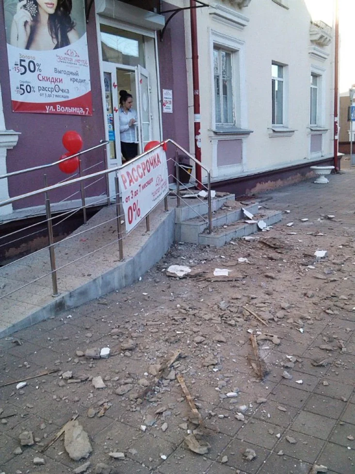 Сегодня с одного из зданий началась обваливаться лепнина, которая была наспех сделана во время подготовки к Дожинкам в Молодечно в 2011 году. Лепнина обвалилась над входом в один из ювелирных магазинов.