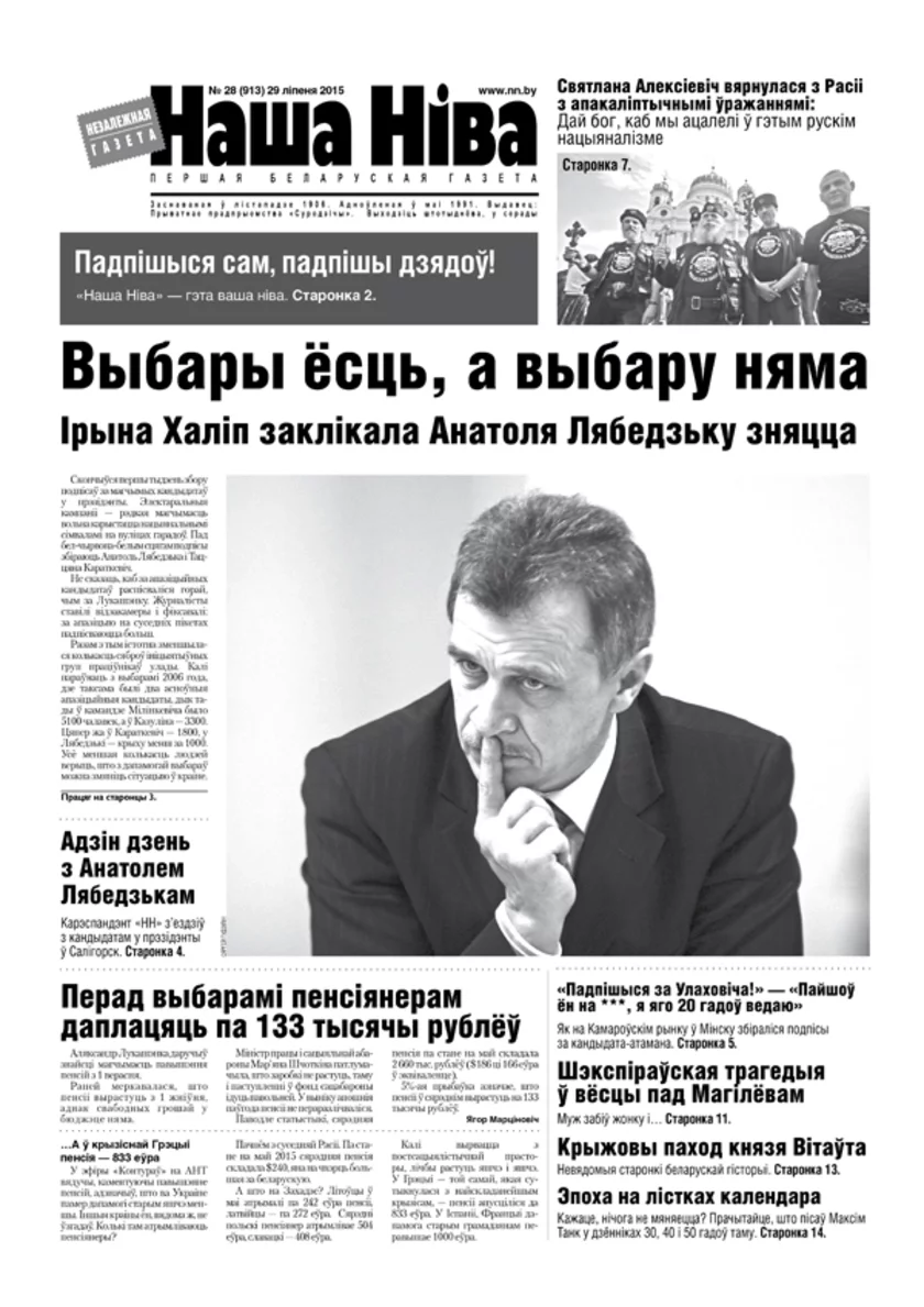 Помните, что Наша Нива/NN.BY — независимая газета. Она существует на пожертвования и средства от продаж. Поэтому она отражает интересы белорусского общества, а не властей. Наша Нива была основана в 1906 г., возрождена в 1991 г. Пожертвовать средства для НН можно в любом банке. Спасибо за поддержку!