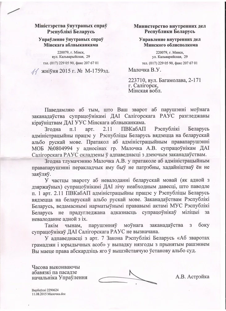 В письме говорится, что составление протокола сотрудниками ГАИ на русском языке, несмотря на требования водителя, чтобы он был по-белорусски, полностью соответствует действующему законодательству и требованиям Процессуально-исполнительного кодекса, который позволяет вести административный процесс на белорусском или русском языке. Переводчика же Александру Молочко не предоставили якобы из-за отсутствия соответствующего ходатайства.