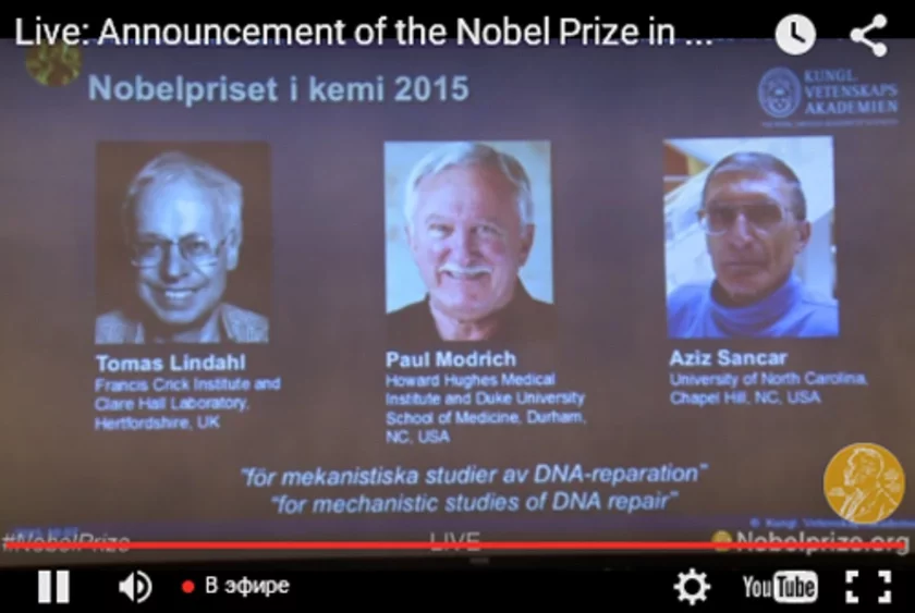 Лауреатами нобелевской премии по химии стали британец Томас Линдл (Tomas Lindahl), Пол Модриx (Paul Modrich; Университет Дьюка, Северная Каролина, США) и Азиз Санкар (Aziz Sancar, род. в Турции; Университет Северной Каролины, США). Такое решение сообщил сегодня Нобелевский комитет.