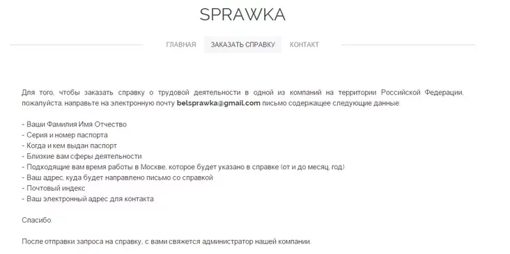 «Для подтверждения того, что гражданин более полугода находился за пределами Республики Беларусь, сегодня национальные налоговые органы требуют представления любого письменного доказательства, в том числе, и справки с места работы гражданина Республики Беларусь, в которой будет подтверждена его трудовая деятельность за пределами страны в течение более полугода, — сообщают производители «справок». — Мы предлагаем вам приобрести данную справку в нашей компании (стоимость 2000 российских рублей с учетом доставки почтовым отправлением в любой населенный пункт Республики Беларусь). Документ, содержащий печать организации, поможет вам подтвердить в региональном представительстве налоговой службы факт вашей трудовой деятельности за рубежом в тот или иной период времени, и избежать уплаты обязательного сбора в размере 20 базовых величин.