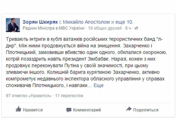 «В марте-апреле Захар и Плотя лишатся своей власти. Открытым остается вопрос, каким образом они будут устранены. То есть, добровольная отставка и возможность сбежать в РФ с награбленным, или физическая ликвидация российскими спецслужбами. Впрочем, не исключено, что могут произойти и покушения, заказные друг на друга. Это вопрос времени», — говорится в сообщении советника.