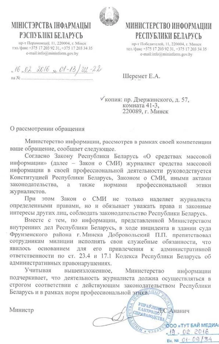 Министерство информации в своем ответе базируется на сведениях от МВД о привлечении журналиста портала TUT.BY к административной ответственности якобы за мелкое хулиганство и неподчинение сотрудникам милиции.