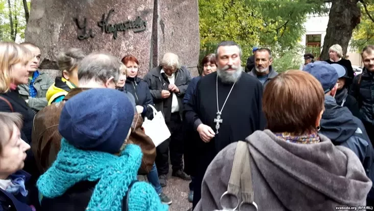 Священник сначала продолжал отшучиваться, и даже перекрестился на памятник Владимиру Короткевичу, возле которого собрались желающие подписать письмо протеста. Но потом начал повышать голос, особенно на тех, кто разговаривал с ним по-белорусски, осуждающе говоря, что они «родились в деревне». Среди собравшихся это вызвало еще большее возмущение, кто-то даже крикнул: «Нам не нужен ваш «русский мир», который вы сюда хотите привести».