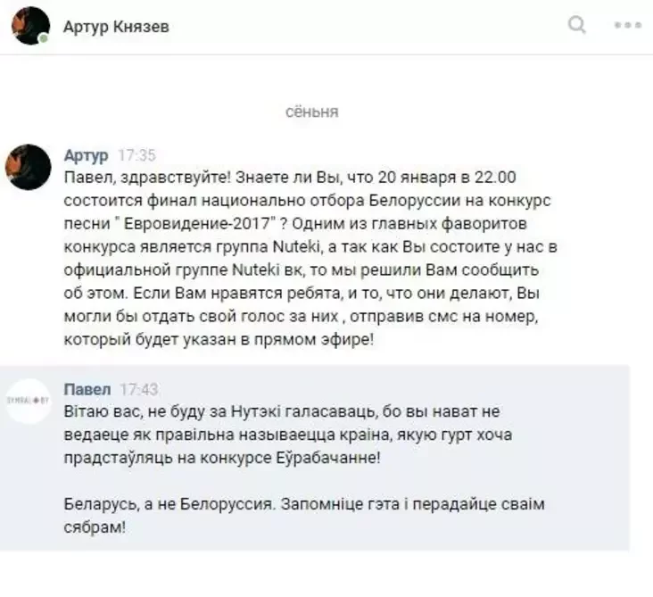 Однако вокруг группы «Nuteki» в этом году сложилась странная ситуация. Руководитель культурной площадки «Арт-сядзіба» Павел Белоус выложил скриншот записи, где неизвестный предложил ему проголосовать за группу «Nuteki», поскольку сам Павел состоит в официальной группе этого коллектива в соцсети. Странно то, что в этом сообщении наша страна была названа как «Белоруссия». Павел возмутился и написал ответ, в котором обратил внимание, что страна, которую намерен представлять этот музыкальный коллектив на международном конкурсе, называется Беларусь: