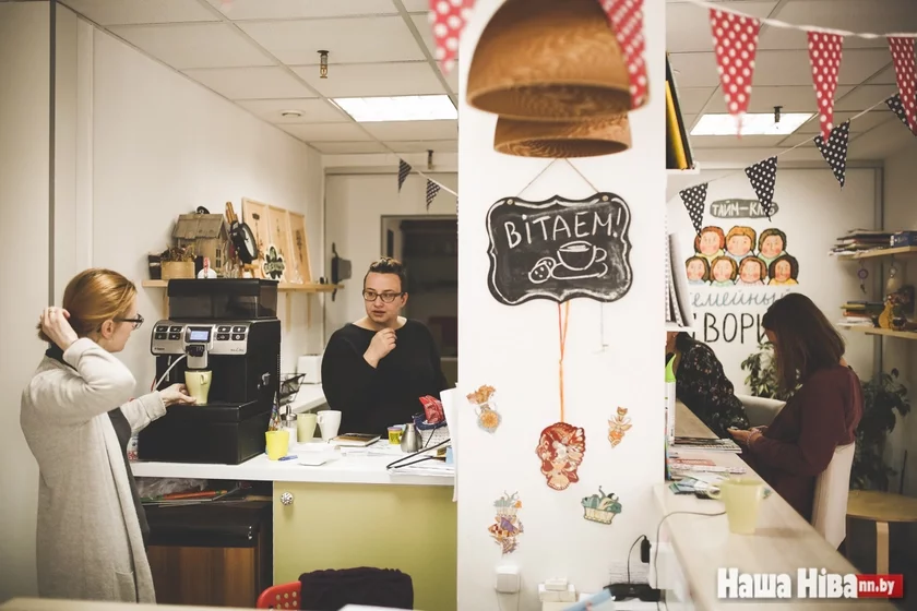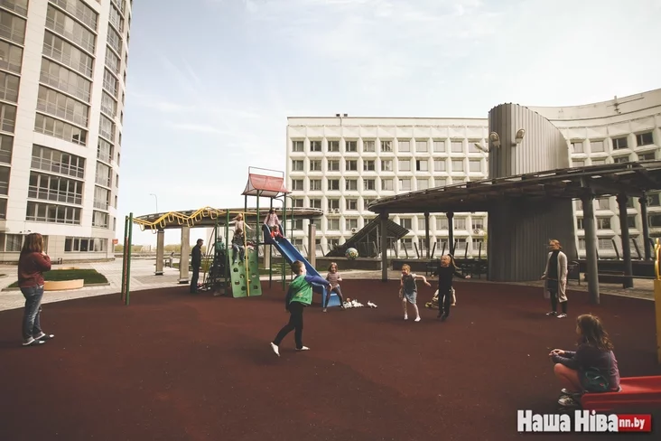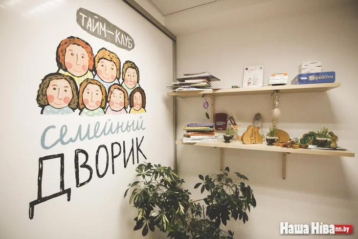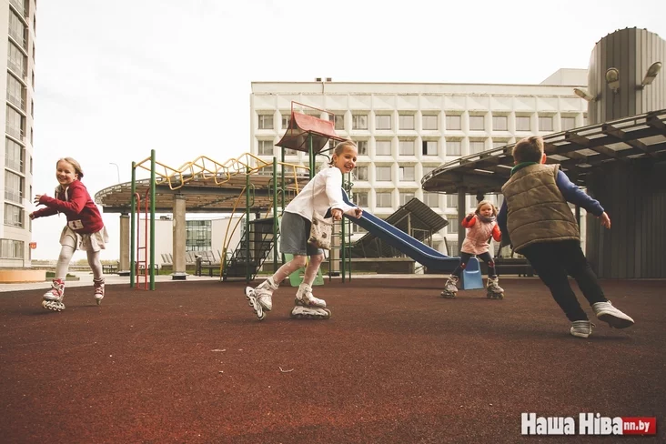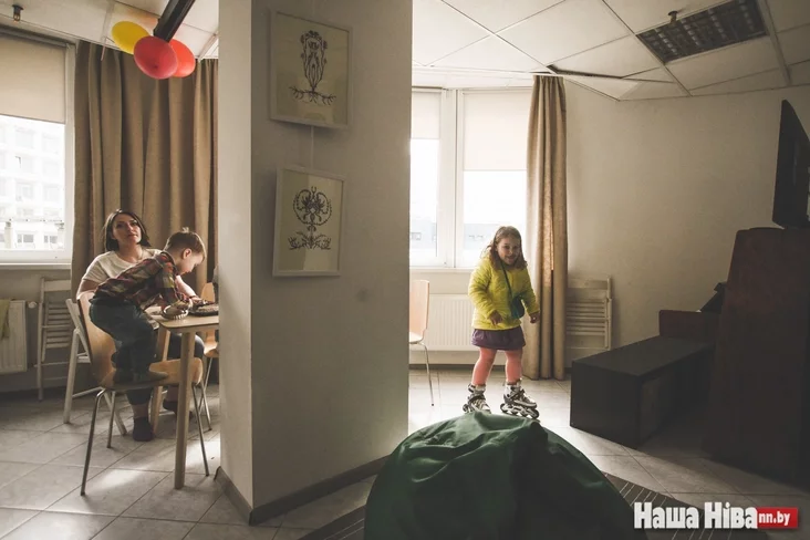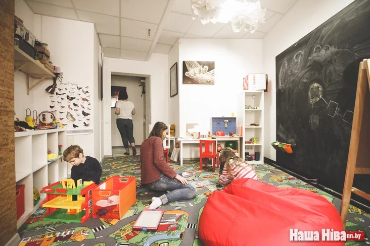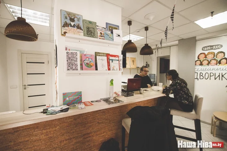 «Школка на падворку» началась с антикафе «Сямейны падворак», где есть отдельная детская комната и где в будни работает няня. Если «Школка на падворку» — альтернатива школе, то «Сямейны падворак» — альтернатива детсаду. Теперь две эти пространства находятся напротив, в нескольких метрах один от другого. Рядом большой внутренний двор с детской площадкой, на которой зачастую занимаются либо дурачатся в свободное время дети.