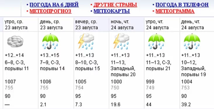В среду ночью преимущественно по востоку, днем на большей части территории страны пройдут дожди, в некоторых районах возможны грозы. В восточных и северо-восточных районах ожидаются сильные дожди. Днем в некоторых районах прогнозируется усиление ветра порывами до 15—20 м/с.