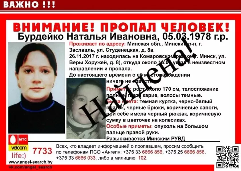 Напомним, 39-летняя Наталья в воскресенье отправилась из Заславля на Комаровский рынок в столице, откуда ушла примерно в 16.00. После этого связь с ней оборвалась. Семья была обеспокоена и объявила женщину в розыск: дома у нее остались трое детей, еще один ребенок — в больнице. На днях у сына был день рождения.
