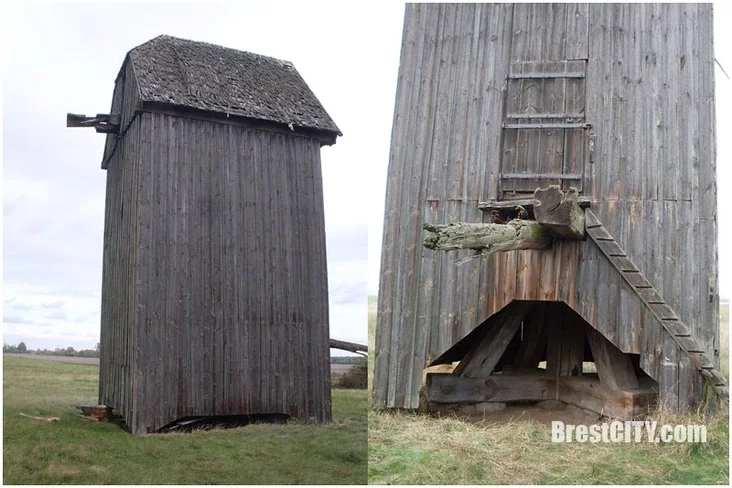 Она стояла на одной «ноге», чтобы можно было ее поворачивать, ориентируясь по направлению ветра. Роль ноги выполнял толстый дубовый столб (стержень). Поворачивали мельницу дышлом — специальным бревном, которое крепилось к основанию строения. Вокруг вкопанного в землю стержневого столпа были построены козлы. Основание мельницы — рама из бруса, а каркас обшит досками.