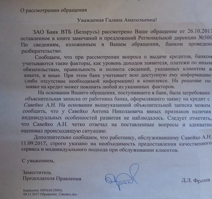 Галина Савейко писала в ВТБ-банк. В ответ получила бумагу за подписью заместителя председателя правления Дмитрия Фролова.