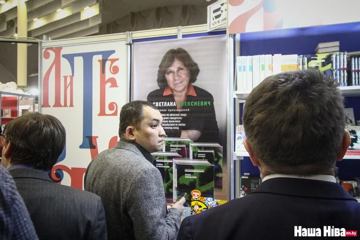 И без того всегда богатые стенды российских издательств в этом году выглядят еще шикарнее. Там же висит портрет нобелевского лауреата, белоруски Светланы Алексиевич. Встреча с ней состоится в субботу. И проходить она будет все же в зрительном зале, а не на большом российском стенде.