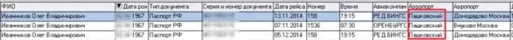 В получившемся наборе данных поразительно было то, что для всех семерых в записях о внутренних авиаперелетах фигурировало одно и то же место назначения. Все семь совершали довольно мало авиаперелетов, однако каждый из них совершил хотя бы один перелет, где пунктом назначения был аэропорт Пашковский.