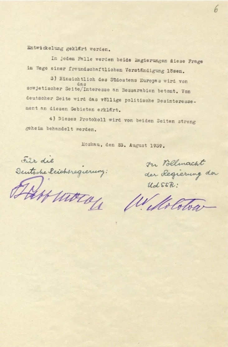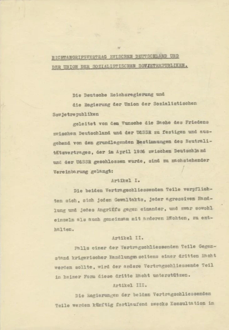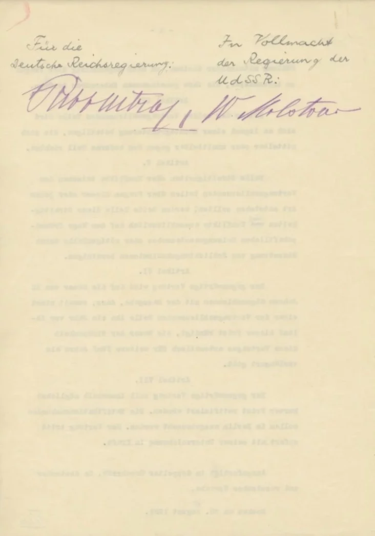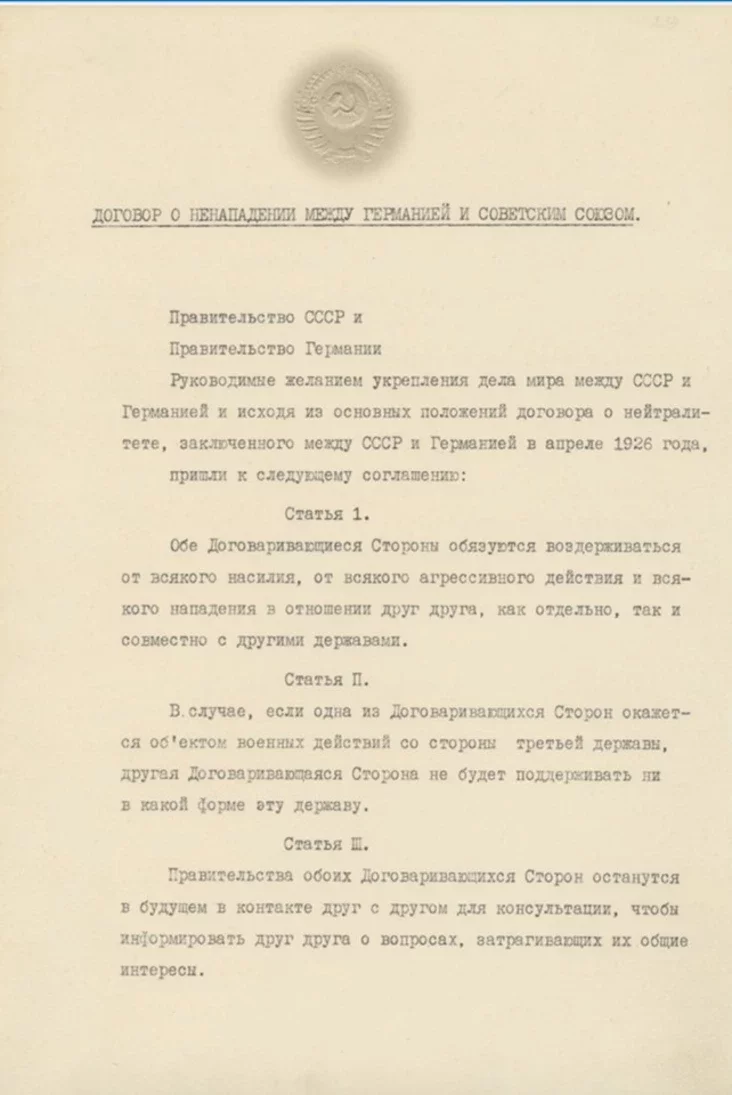 Договор о ненападении между СССР и Германией был заключен 23 августа 1939 года. Документ был подписан главами внешнеполитических ведомств Вячеславом Молотовым и Иоахимом фон Риббентропом.