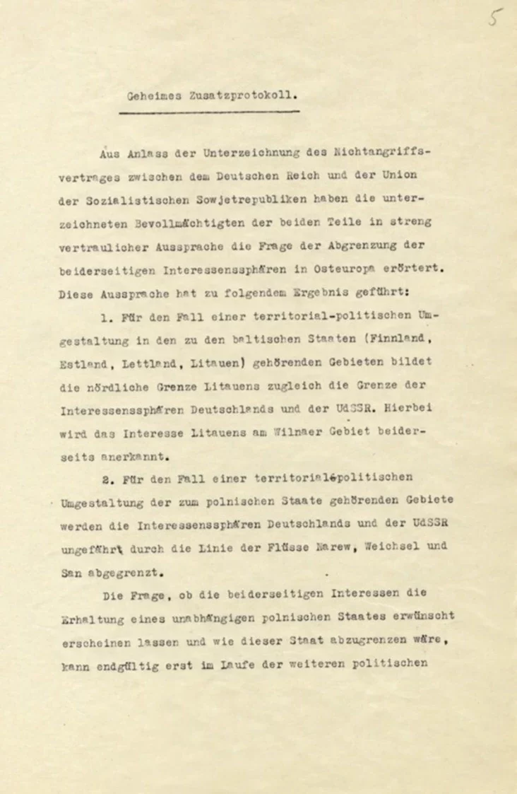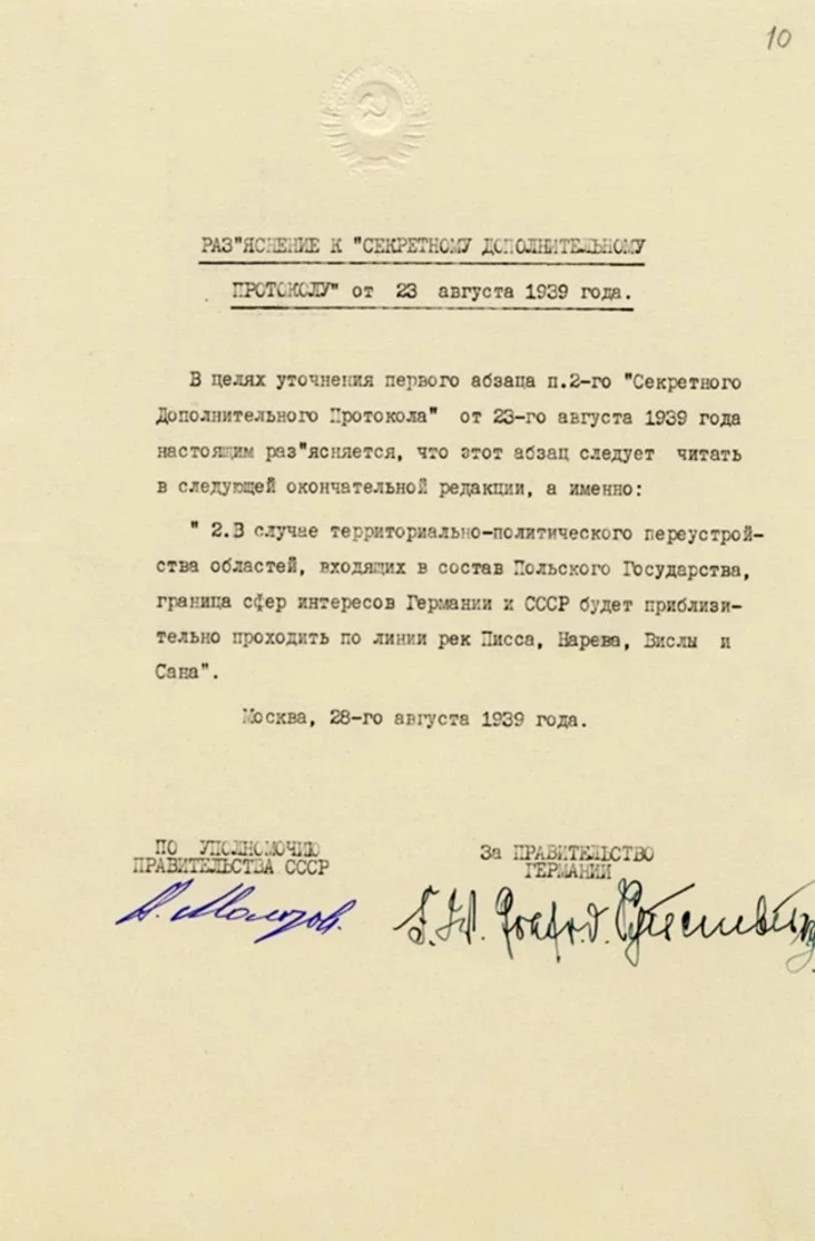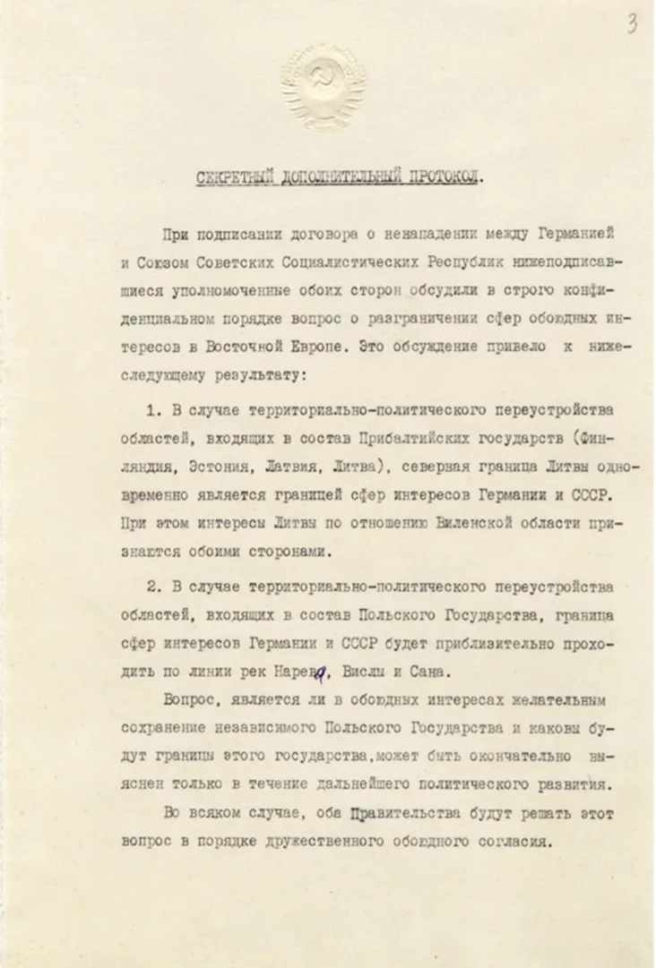 Также опубликовали секретный дополнительный протокол к договору, в котором страны договорились о разграничении сфер обоюдных интересов в Восточной Европе. В соответствии с протоколом в зону интересов СССР входят страны Прибалтики, а также Польша и Бессарабия — часть современных Беларуси, Украины и Молдовы.