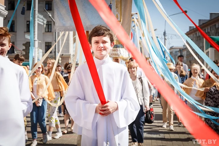 2 июня в Минске сотни католиков прошли в процессии Божьего тела. Традиционно особое значение этот праздник имеет для детей, которые в этом году впервые причащались. Они одеты в белые одежды, символизирующие чистоту души и помыслов, сообщает Tut.by.