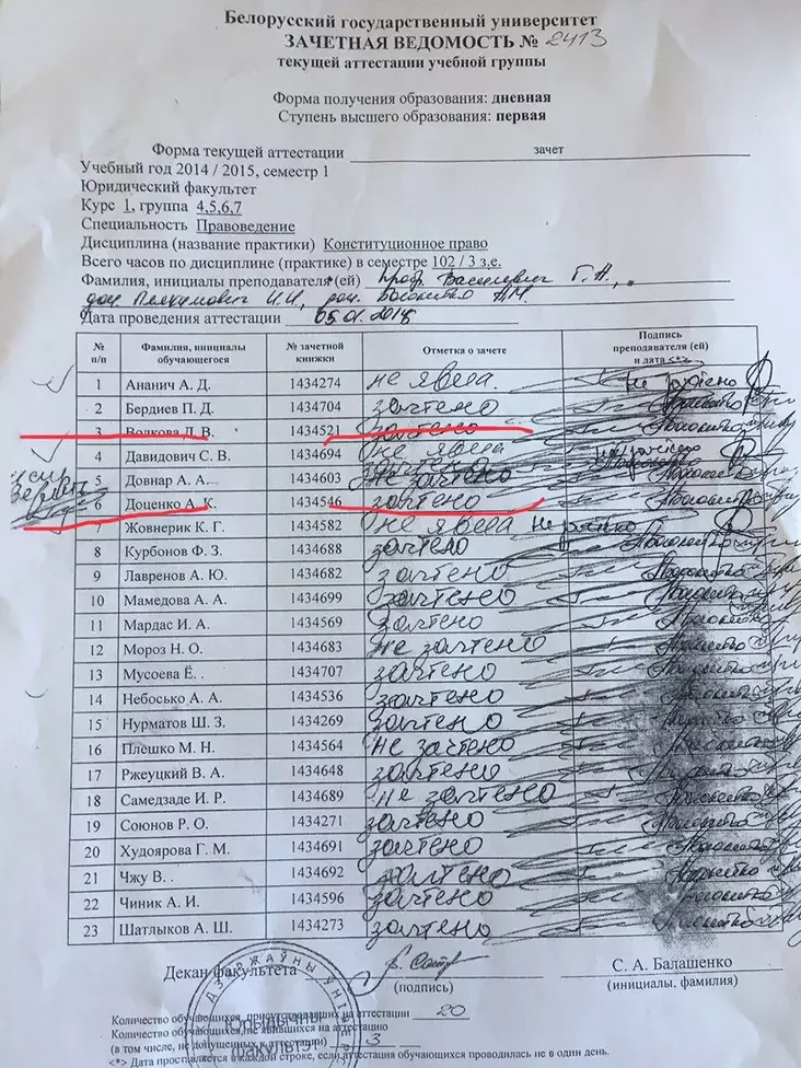 Но в той зачетной ведомости, которую Пляхимович недавно взял в деканате, оценка студента исправлена на «зачтено». Старая оценка «не зачтено» зачеркнута, а рядом две подписи — заведующего кафедрой Василевича и доцента Боголейко — с надписью «Испр[авленому] верить».