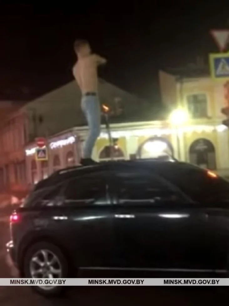 Пьяный парень забрался на крышу чужой машины и стал танцевать. Его задержали