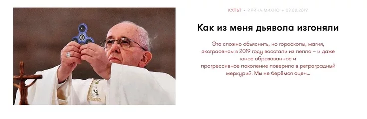 Католический верующий Артем Ткачук возмутился тем, что сайт kyky.org использовал измененное фото Папы Франциска в качестве заставки к статье «Как из меня дьявола изгоняли», на ней Папа Франциск в руках вместо Святых Даров держит спиннер.