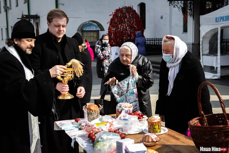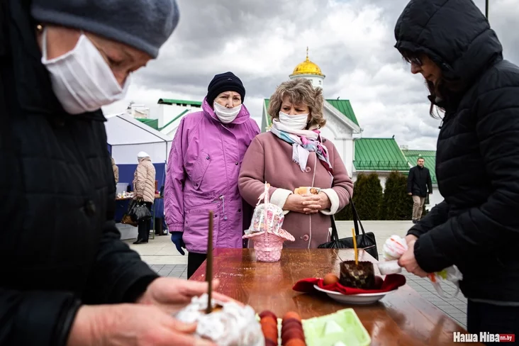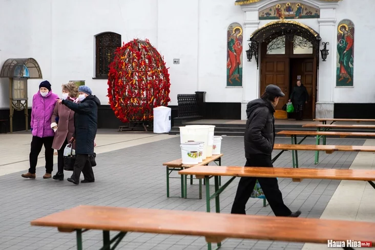 Однако некоторые верующие пришли освятить пасхальную пищу возле минских храмов. Людей действительно меньше, чем в другие годы, многие стараются придерживаться дистанции, в храмах висят листки с советом о дистанции.
