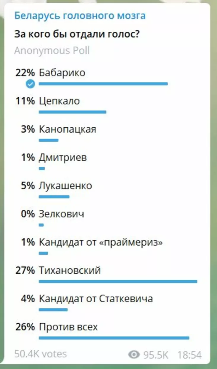Более 50 тысяч человек проголосовали в опросе «За кого бы вы отдали голос» на крупнейшем оппозиционном телеграм-канале.