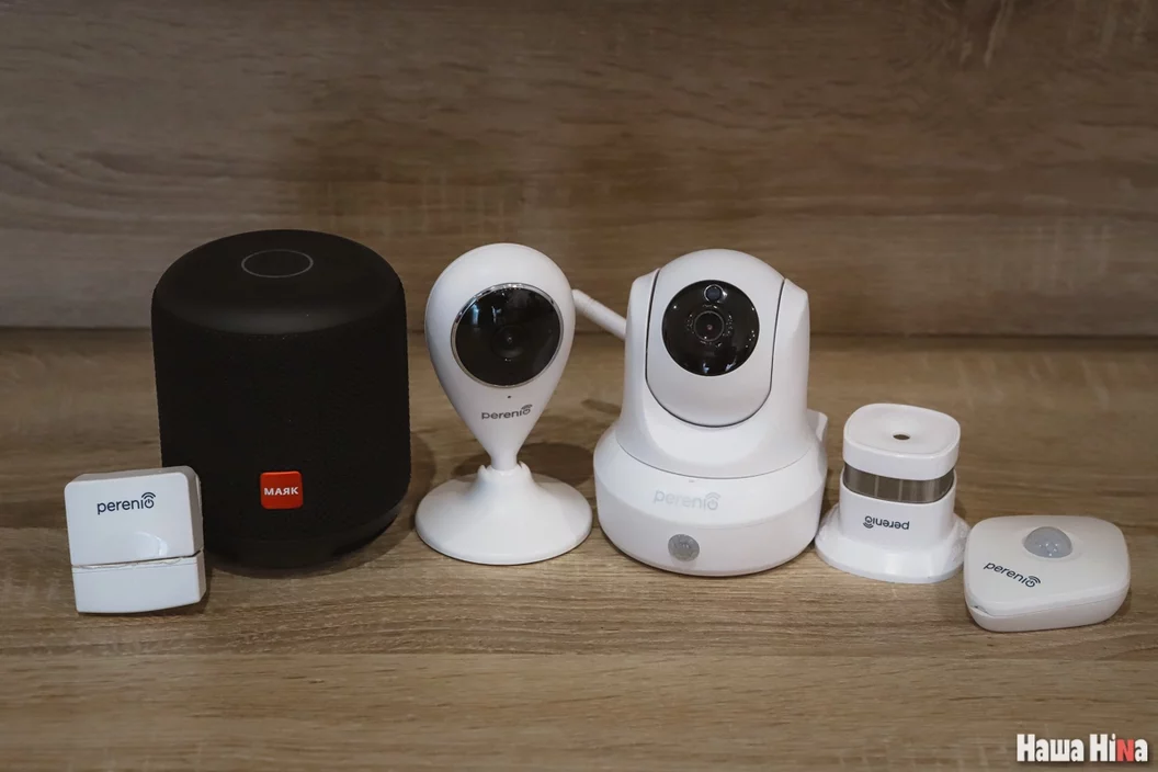 В нашем тест-драйве мы проверяли, как работают устройства, входящие в систему «А1 Умный дом», представленную в Беларуси телеком-оператором А1 совместно со стратегическим технологическим партнером Perenio IoT: (слева направо на следующем фото) датчик открытия двери, портативная колонка, стационарная и поворотная камеры видеонаблюдения, умная розетка Power Link, датчик дыма и датчик движения.