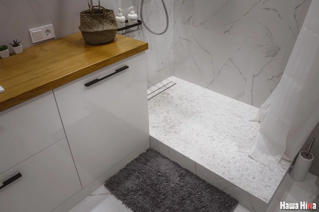 Что в квартире особенно необходимо, так это датчик протечек. Евгения объясняет: всё дело в модном ремонте, вместо душевой кабины у нее специальная платформа, без бордюров. Вода стекает благодаря небольшому уклону.