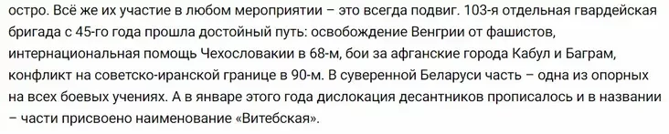 Витебская десантная бригада прошла достойный путь, сообщил 16 июля государственный телеканал ОНТ. Перечисляется «интернациональная помощь Чехословакии в 1968-м и бои за афганские города Кабул и Баграм».