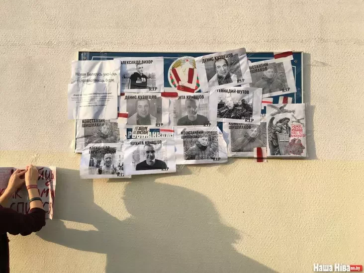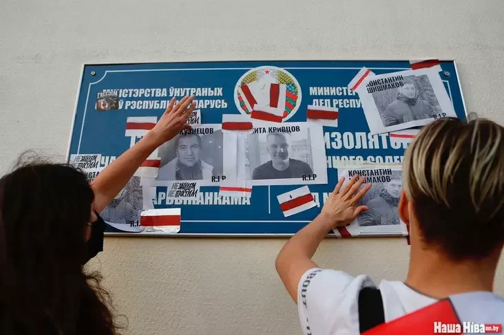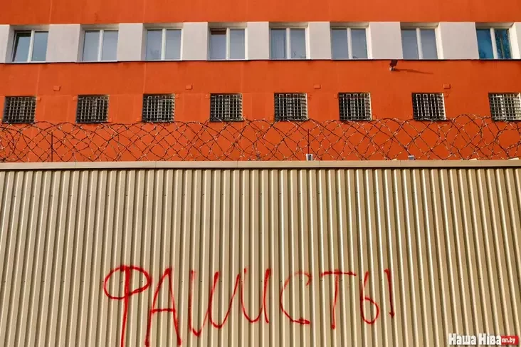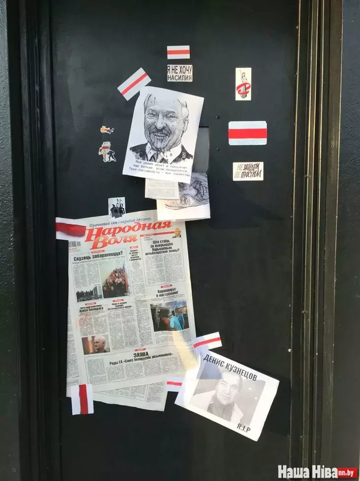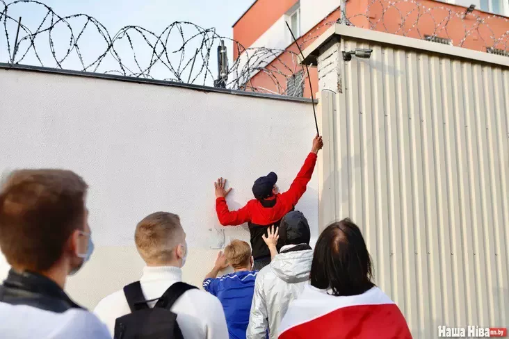 Подошедшие к Окрестина демонстранты оставили здесь различные послания. После того как колонна отошла, вышли вооруженные сотрудники изолятора и начали отдирать от стен народное творчество.