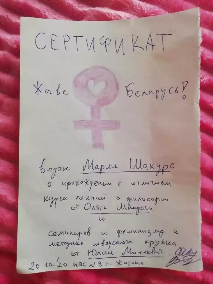 «Во вторник [13 октября] меня, Юлию Мицкевич и еще одну девушку перевели с Окрестина в Жодино. Изначально нас поместили в камеру на четырых, в среду к нам перевели Светлану Гатальскую [фем-активистка и член Координационного совета]. Через два дня нас перевели в камеру побольше, где мы встретили Ольгу Шпарагу.