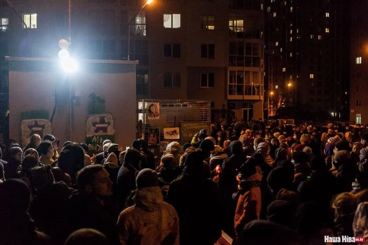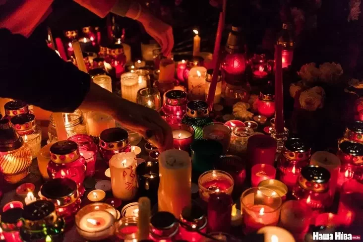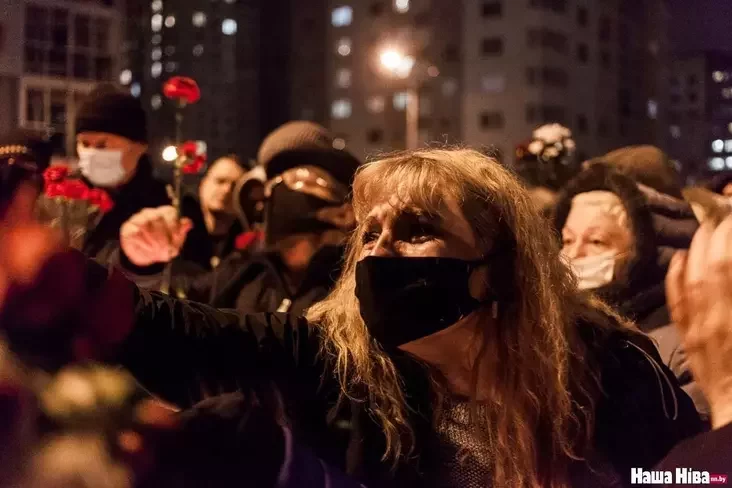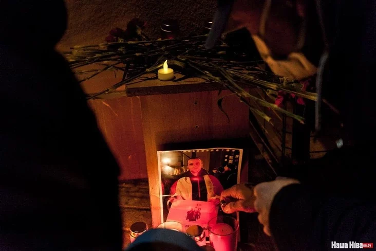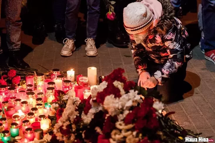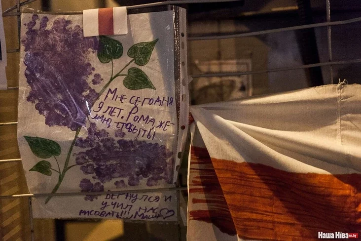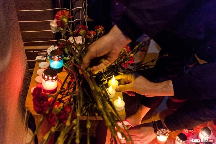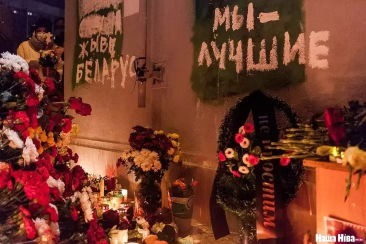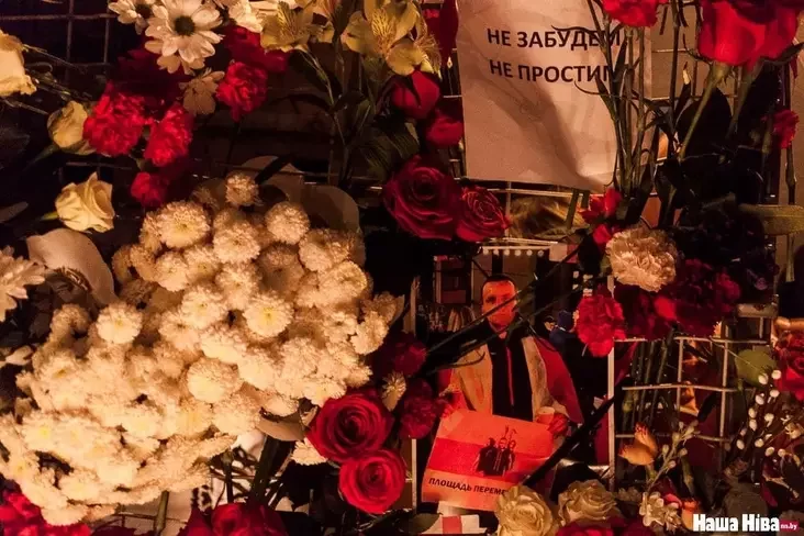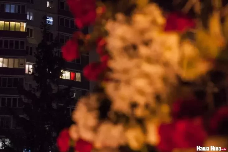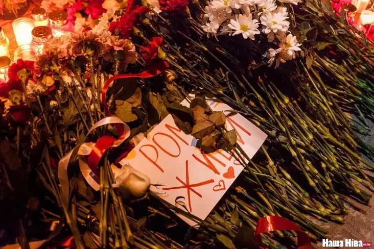 Люди несут и везут цветы к муралу на площади Перемен, что в квартале между улицами Червякова, Каховской и Сморговским трактом в Минске. Оттуда вчера вечером забрали Романа Бондаренко, которого впоследствии в Центральном РУВД отдали скорой помощи в бессознательном состоянии. Сегодня вечером он умер.