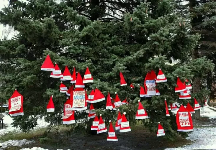 В Минске в районе Парка Челюскинцев креативно украсили новогоднюю елку, сделав различные актуальные пожелания