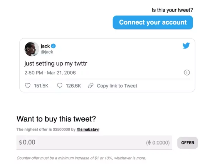 Теперь NFT становится популярным в сфере продаж цифрового искусства, но NFT может быть любой цифровой актив (например, изображения, музыка, искусственный интеллект). И даже твит. Соучредитель Twitter Джек Дорси продал свой первый твит более чем за 2,9 миллиона долларов.